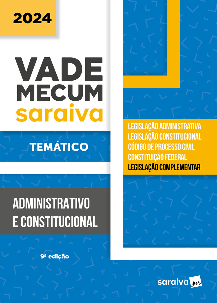 Data de Fechamento da obra: 8-1-2024 A Saraiva Jur, pioneira na exemplar técnica desenvolvida de atualização de legislação, apresenta sua coleção Vade Mecum Temáticos. São cinco obras que contemplam, em cada volume, as principais áreas de atuação do direito: Administrativo e Constitucional; Civil e Empresarial; Penal; Trabalhista e Previdenciário; e Tributário. Elaborados e organizados a partir da seleção dos principais diplomas legislativos em cada área, notas de correlação entre eles e índices facilitadores de busca, os Novos VadesTemáticos constituem material imprescindível de consulta e pesquisa. Indicados para a 2.ª fase do Exame de Ordem Unificado, contemplam todo o conteúdo exigido nos editai da OAB, e seu uso é permitido para consulta durante aprova. Recomendamos ,para maior abrangência, que seu uso seja acompanhado do Vade Mecum OAB e Graduação. Para profissionais e acadêmicos, constituem importante ferramenta de estudo e consulta em diferentes áreas de atuação do seu dia a dia. Acompanha uma NOVIDADE exclusiva para você: ¿ Saraiva Conecta ¿ plataforma de conteúdos complementares ao seu Vade Mecum Temático, na qual você terá acesso a materiais de estudo e ao serviço Atualize seu Código! Últimas atualizações: Constituição Federal (até EC n. 132, de 20-12-2023) - Código de Processo Civil Ações de guarda (Lei n. 14.713, de 30-10-2023) Contrato de contra garantia (Lei n. 14.711, de 30-10-2023) Assinatura de títulos executivos eletrônicos (Lei n. 14.620, de13-7-2023) - Legislação Complementar Regimento do STF (até a Emenda Regimental n. 59, de 18-12-2023) Lei Orgânica Nacional das Polícias Militares e dos Corpos de Bombeiros Militares(Lei n. 14.751, de 12-12-2023) Lei Orgânica Nacional das Polícias Civis (Lei n. 14.735, de 23-11-2023)Terras Indígenas (Lei n. 14.701, de 20-10-2023)Regimento do STJ (Até Emenda regimental n. 44, de 13-9-2023)Voto de qualidade do CARF (Lei n.14.689, de 20-9-2023)Arcabouço Fiscal (Lei Complementarn. 200, de 30-8-2023)Estatuto Nacional de Simplificação de Obrigações Tributárias Acessórias (Lei Complementar n. 199, de1.º-8-2023)Estatuto da OAB ¿ alterações (Lein. 14.612, de 3-7-2023)Presidência da República e Ministérios (Lei n. 14.600, de 19-6-2023)Sistema de Integridade Pública (Decreto n. 11.529, de 16-5-2023)Transferência de recursos da União (Decreto n. 11.531, de 16-5-2023)Sistema de Leilão Eletrônico (Decreto n. 11.461, de 31-3-2023)Sistema de Registro de Preços (Decreto n. 11.462, de 31-3-2023) Súmula Vinculante 59 Súmulas657 a 665 do STJ